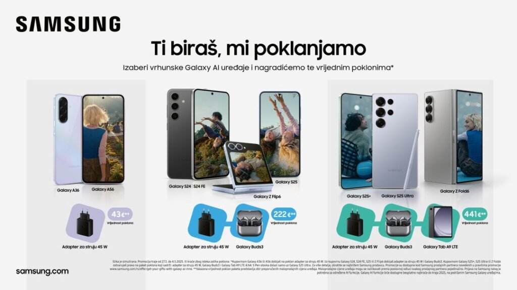 Samsung uvodi posebnu Galaxy promociju od 27. marta do 4. maja 2025. godine ili do isteka zaliha. Korisnici koji kupe Galaxy A36 ili A56 dobijaju 45 W strujni adapter. Oni koji se odluče za Galaxy S24, S24 FE, Z Flip6 ili S25 na poklon dobijaju 45 W strujni adapter i Galaxy Buds3 slušalice. Korisnici koji kupe Galaxy S25+, S25 Ultra ili Z Fold6 će dobiti 45 W strujni adapter, Galaxy Buds3 slušalice i Tab A9 LTE. U okviru ove ekskluzivne ponude, korisnici će dobiti ne samo najsavremeniji telefon, već i osnovnu dodatnu opremu za još bolje Galaxy iskustvo. Novi Galaxy uređaji se ističu po svojim naprednim AI kapacitetima, kvalitetnim ekranima i dugoročnoj softverskoj podršci i tako korisnicima pružaju savršeno mobilno iskustvo okrenuto ka budućnosti.