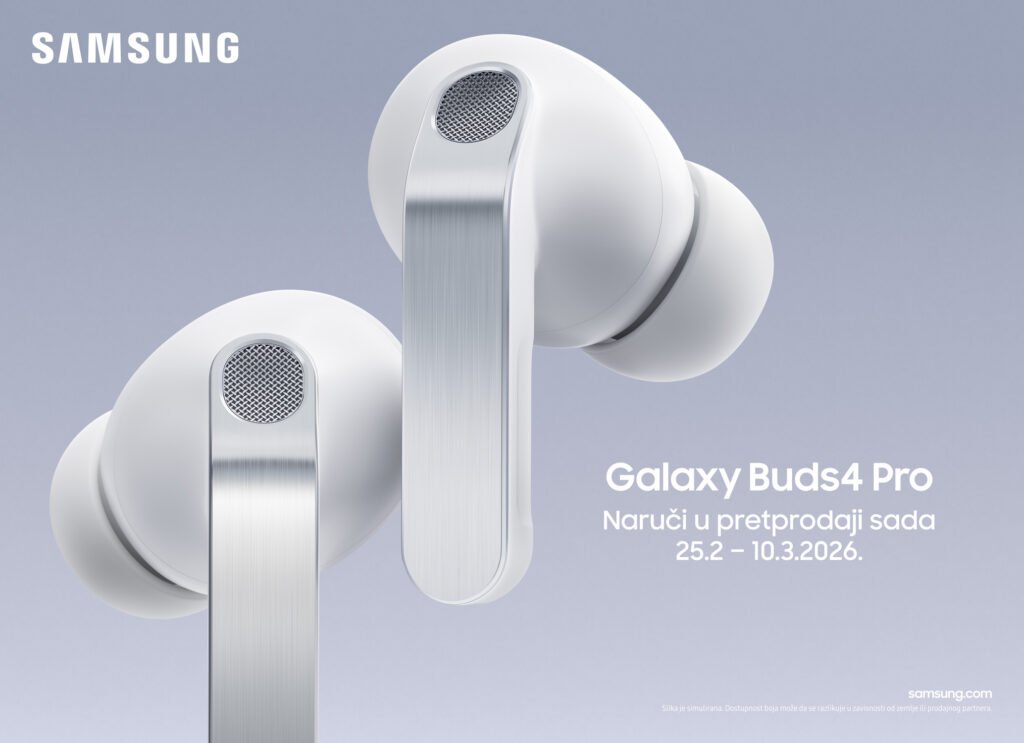 Podgorica, 25. februar 2026. – Samsung Electronics danas je predstavio najnovije Galaxy Buds4 Pro i Galaxy Buds4, redefinišući šta premium slušalice mogu ponuditi u pogledu vrhunskog Hi-Fi zvuka i svakodnevne udobnosti. Dizajnirana da zvuči jednako dobro koliko i ugodno pristaje, Galaxy Buds4 serija spaja izvanredan kvalitet zvuka s računarski optimizovanim oblikom, objedinjavanjem najnaprednijih Samsung inovacija u audio tehnologiji i ergonomiji u jedno besprijekorno iskustvo. Po prvi put, Buds4 Pro donosi širi wooferu kombinaciji s poboljšanim Aktivnim poništavanjem buke (ANC) i uz unaprijeđen Adaptive Equalizer (EQ), pružajući zvuk punog spektra vjeran originalnoj snimci, dok se inteligentno prilagođava uslovima iz stvarnog života. Promišljeni dizajn, intuitivne hands-free kontrole i dublja AI integracija dodatno naglašavaju posvećenost kompanije Samsung slušalicama koje prate način na koji ljudi slušaju, kreću se i svakodnevno koriste svoje slušalice.